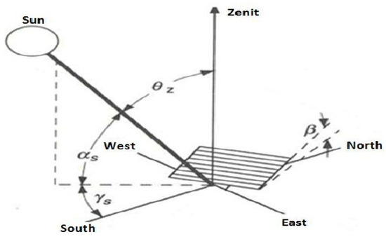 As shown in Figure 2, θz is the incidence angle, that is, the angle between the beam radiation on a plane and the normal to that plane. ψ is the latitude, which is the angular position north or south of the equator, north positive ranging −90° ≤ ψ ≤ +90°, and β is the slope, which is the angle between the surface plane and the horizontal ranging 0° ≤ β ≤ 180° (β < 90° represents that the surface has a downward-facing part). γs is the surface azimuth angle, which is the deviation of the projection on a horizontal plane from the normal to the surface from the local meridian, with zero due south, east negative, and west positive ranging −180° ≤ γs ≤ 180°, and ω is the solar hour angle, which is the sun angular displacement east or west of the local meridian, which is negative in the morning, positive in the afternoon, equal to zero at solar noon and fluctuates by 15 degrees per hour from solar noon, and δ is the declination angle, which is the sun’s angular position at solar noon, with respect to the equatorial plane [19,20].