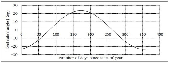 where n is the nth day of the year; thus, 1 ≤ n ≤ 365 (i.e., n = 1 to 1 January, n = 32 for 1 February, etc.). It is also the angle between the equator and a line drawn from the Earth’s center to the sun’s center, positive within the northern hemisphere summer, and negative within the northern hemisphere winter. Since the earth is tilted at a 23.45-degree angle, the angle of the sun’s ray incident on the earth differs all over the year. On the spring and autumnal equinoxes, the angle is zero degrees, while on the winter and summer solstice, the angle is 23.45, and −23.45 degrees, respectively, as displayed in Figure 3 [21].