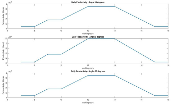 In this instance, it should be noted that the data for the pump, well, and solar cells were entered by altering the tilt angles of the solar cells while keeping the same number of panels, where we divided the panels equally into six panels facing south, six panels facing east, and six panels facing west, and the productivity at an angle of 0 degrees was the largest and best, giving the greatest productivity from sunrise to sunset. The productivity is higher than in the first case, and we can see that this method has given us the most working hours.