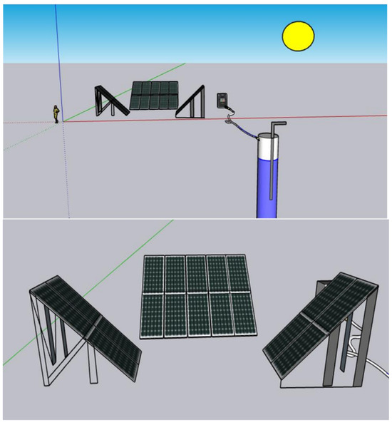 The second instance, to increase working hours and compare productivity, the solar panels were installed at different angles, each with six panels at different angles, respectively. We divided the matrix equally into six southern panels, six eastern panels, and six western panels, as shown in the Figure 8, using the SketchUp program, and the data and shape were entered into the MATLAB program as follows: the pump, well, and solar cell data were entered while changing the inclination angles of the solar cells while maintaining the same number of panels. This is called the installation of irregular solar panels, and they can be used in agricultural areas and large industrial projects to achieve the maximum benefit from solar rays and obtain high efficiency.