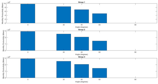 Third instance, we divided the matrix into ten panels in the south, four panels in the east, and four panels in the west as shown in Figure 11, and studied the system and its productivity. The same data that was entered in the first case were used, but the solar cells were placed in an irregular manner in order to operate the pump during oper-ating hours and increase daily output to receive the maximum radiation for the longest time as shown in Figure 12 and Figure 13. And the output was divided into three totals in order to calculate the current generated in each of these three periods for each angle across all groups as shown in Figure 14 and Figure 15.