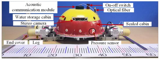 A small spherical robot was designed in our laboratory based on the flexible movement characteristics of sea turtles in water, as shown in Figure 1. The robot was composed of two hemispheres that were joined with a mid-plate [19]. The upper hemisphere was divided into two parts, namely the water storage compartment and the sealed compartment. Water could enter the storage compartment through the four holes distributed around the water storage cabin when the small spherical robot dives into water, which helps with reducing the buoyancy of the robot. A sealed cabin was utilized to load the electrical system. The lower hemisphere was the vector propulsion system, which was bounded by two separate quarter spherical shells. The lower hemisphere could be opened or closed by servo motors on both sides [20]. A stereo camera, an inertial measurement unit (IMU), 12 pressure sensors, and an acoustic communication module were attached to the small spherical robot. For convenience, we designed a detachable battery pack that was fixed to the middle partition of the robot. The battery pack included three 7000 mAh lithium batteries, which were sealed in a cabin. The prototype of a small spherical robot is shown in Figure 2. In addition, Table 2 lists the technical parameters of the robot.