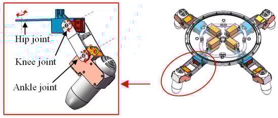An advantage of the small spherical robot lies in its vector propulsion mechanism, as shown in Figure 3. It can be seen that four sets of propulsion units comprised the propulsion system [19]. Each unit consisted of a hip, knee, and ankle joint, which could rotate around a self axis. As a result, the vector propulsion was very flexible. In order to ensure that the center of gravity and the centroid coincided, an “H”-shaped propulsion strategy was adopted [21]. The “H” shape propulsion strategy is shown in Figure 4; the strategy ensures that the hip and knee joint are kept still and only the ankle joint can be adjusted. In this situation, the driving force is composed of three forces / moments: surge force , heave force , and yaw moment .