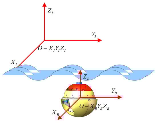 Aiming at building the dynamic and kinematic models of the small spherical robot, a body reference frame () and an inertial reference frame () were established, as shown in Figure 5. The position and attitude angle of the robot, denoted as vector , is described in the inertial coordinate system: