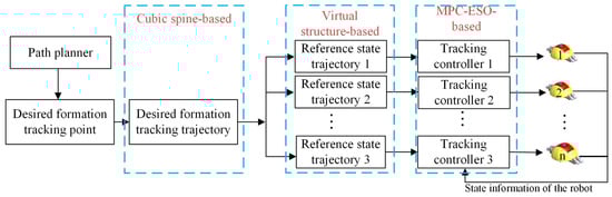 In order to achieve formation control of multiple small spherical robots, a trajectory tracking-based formation strategy was proposed, which splits the formation problem into the trajectory tracking problem of a single robot, as shown in Figure 6. Firstly, the cubic spine method was utilized to obtain the desired formation trajectory based on the discrete formation path point. Then, according to the desired formation shape, the desired trajectory of each robot could be acquired by the virtual structure method. Finally, a tracking controller based on linear MPC and ESO was proposed, as shown in Figure 7. Detailed information of the formation tracking control are shown as follows.