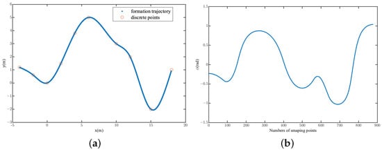For convenience of description, this section takes a two-dimensional format as an example to introduce the formation. Discrete formation path points provided by the path planning layer are denoted as . is the position of the i-th discrete path point. N is the number of the discrete path points. An interpolation method based on cubic splines was adopted to compute the other information of the robot. The cubic spline refers to the curve between each cell being a cubic equation, and the cubic spline equation must meet the following conditions.