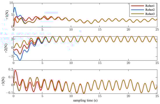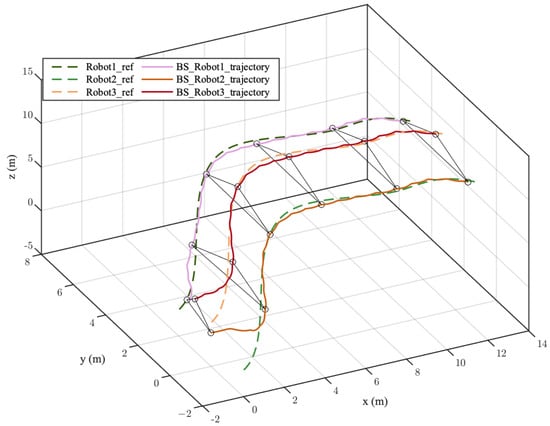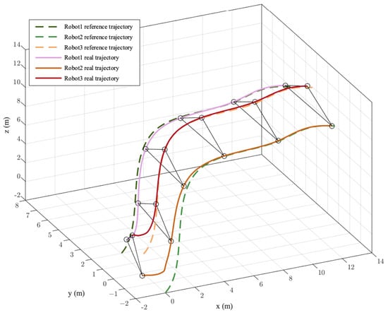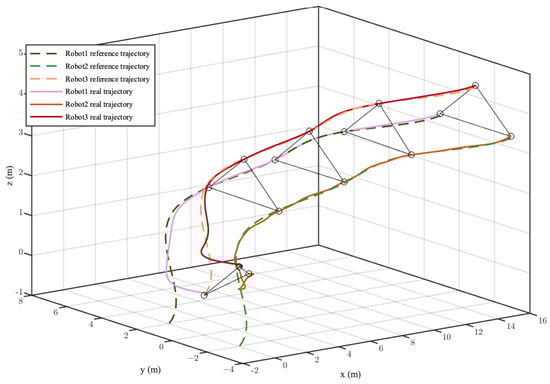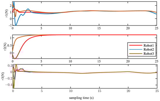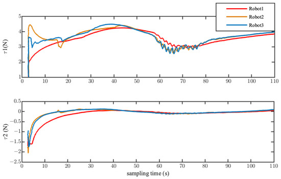The start point and final point in the single scene were set as and , respectively. The formation shape was a triangle, as shown in Figure 19b. The initial position of the three spherical robots were , , and . The real formation tracking result is depicted in Figure 20. It can be seen that the initial shape composed of three robots was different than the desired formation shape, and each robot was far away from the desired trajectory. Under the adjustment of the controller, the three robots gradually converged to the corresponding reference trajectory while maintaining a basic triangular formation. The trajectory tracking error and formation error are shown in Figure 21. Most of the tracking errors of each of the robots converged to 0. The convergence error of Robot 2 in the x-direction did not exceed 0.1 m. The formation errors of y and converged to zero, and the formation error of x did not exceed 0.2 m. Table 5 lists the root mean square errors of the trajectory tracking and formation constraints. The maximum formation error between the robots was 0.1532 m, which is 0.05 times the size of the formation shape. The control inputs of the three spherical robots are shown in Figure 22. The input values of each of the robots followed the constraints all of the time during the formation process.