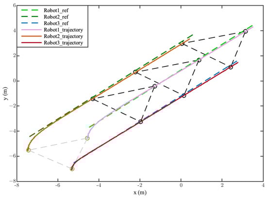 where is the predictive horizon, is the controlling horizon, is the weighting factor, and is the relaxation factor. are the weighting matrices. The first term of Equation (35) is to ensure that the state vector of the robot approaches the desired state vector. The second term guarantees the distance between the i-th robot and the j-th robot. The third term aims at minimizing the increment of control input. The purpose of the last term is to prevent an optimization problem from being unsolved.