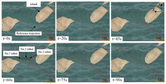 The start point and final point in the complex water scene were set as and , respectively. The formation shape was a line, as shown in Figure 19a. The initial position of the three spherical robots were , , and . Figure 23, Figure 24, Figure 25 and Figure 26 show the simulation results of the three spherical robots, which formed a linear formation shape in a complex water scene. As shown in Figure 23, the initial positions of the three robots showed a triangular formation and deviated from their respective reference trajectories. Under the adjustment of the controller, the robots accurately converged to their respective expected trajectories and maintained a line formation. The trajectory tracking errors during the formation process are shown in Figure 24a. The tracking errors of the state variable x and basically converged to 0, while the state variable y had a convergence error of 0.2 m. The formation error is shown in Figure 24b. It can be seen that the state error of any of the two spherical robots converged to zero. In addition, Figure 26 is a screenshot of the linear formation process. At approximately t = 20 s, the three robots formed a linear formation and maintained this formation shape to track the desired trajectory. The control input is shown in Figure 25. As can be seen, the input values fluctuated up and down but remained within the constraint range. The fluctuations of the control input were mainly caused by the curved formation reference trajectory.