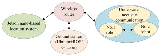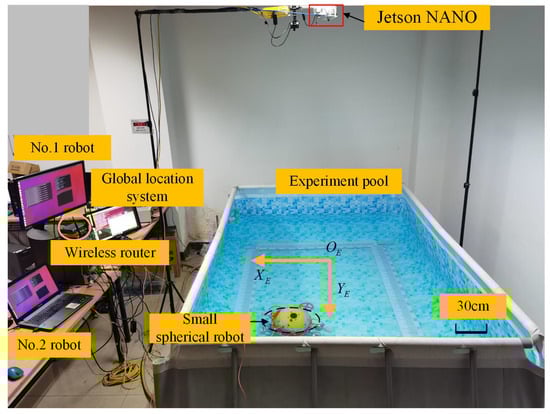 The experiment was carried out in a indoor pool with the dimensions of 3.5 m × 2.5 m × 1 m (length × width × height). The framework of the multi-spherical robot formation experimental platform is shown in Figure 27, and it mainly consists of the Jetson NANO positioning system, two small spherical robots, a wireless AP/router, and a ground control station. The Jetson NANO system utilized a down looking camera to identify and locate the spherical robots, as well as to monitor their surroundings environment, such as obstacle detection. Then, the position information was wirelessly transmitted to the ground station through the TCP/IP protocol. When receiving the information released by the positioning system, the spherical robots extracted the self current position. In addition, the ground station utilized an ROS communication mechanism to receive information such as the position and posture of the multiple robots; in addition, it performed real-time rendering in the Gazebo environment. The two spherical robots used in the experiment are shown in Figure 28. The experimental environment is shown in Figure 29, where a circular red mark indicates the origin of the world coordinate system.
