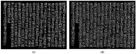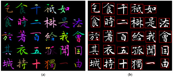 Figure 3 illustrates the morphological connected component segmentation based on distances between the centroids of different connected regions, which is used to obtain the font box (Figure 3b). The morphology-based connected component analysis algorithm also performs well in segmenting calligraphy characters, as it is unaffected by character deformation and can adapt to the complex morphology requirements of calligraphy character segmentation.