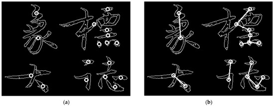 - Only take the nearest point to the centroid that is less than distance , and recognize it as the centroid point of the stroke of the same character. There may be cases where points are mutually nearest to each other. Figure 4b illustrates the connection of centroid points.
