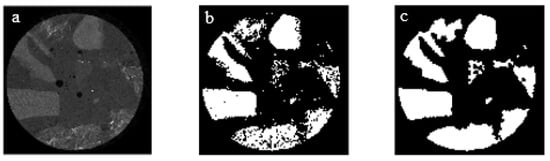 In parallel, after binarizing the images highlighting the gravel (Figure 1b) as described in the previous section, it was necessary to perform morphological opening and closing operations ([36]) to filter noise and connect the contiguous regions of the image. The result of these operations is shown in Figure 1c. Improved definition of the contours of the gravel regions and uniformity of the color inside those regions can be observed. The number of white pixels in each of the 2100 axial images of the binarized and corrected core enable estimation of the volumetric percentage of gravel. The white area in image i is denoted by B i , i = 1 , 2 , , 2100 ( p i x e l 2 ) ), and the volumetric percentage of gravel in the i-th section of the core can be estimated by the ratio B i / A i . Thus, the volumetric percentage of gravel, G, in the entire core can be approximated by the mean of the percentages of gravel in the 2100 cross-sections of the core, i.e.,