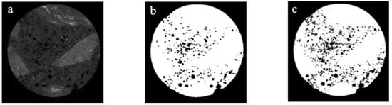 • Segmentation (pores, EVA, fiber, and exterior) + remainder = differentiation of the light aggregates, air, and pores from the remainder, as shown in Figure 2c, where pores, EVA, and fiber + area outside the sample (air) are black and the remainder of the image is white. This segmentation was performed using the range-constrained Otsu method [26] which lead to optimal threshold. A first attempt was made with the original Otsu method [32], but the result was unsatisfactory due to a known feature of the method of shifting the thresholds towards the class with the greatest variability. The result obtained with the classic Otsu method for the example image is shown in Figure 2b. There is a lower density of dark regions within the sample and a smaller average size of these regions; this indicates that the method was not successful in capturing the smallest pores present in the sample at the maximum resolution possible.