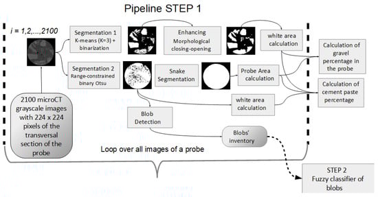 At this point, after estimating the percentages of gravel (G) and cement paste (C), it remained necessary to estimate the percentages of the light, coarse aggregates (EVA and fiber) and the pores. The pipeline executed thus far is illustrated in Figure 3.
