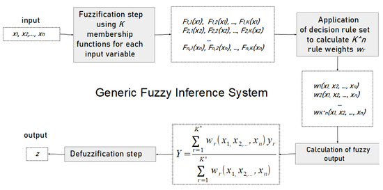 The input vector ( x 1 , x 2 , , x n ) contains n crisp variables x i , i [ 1 , n ] , each of them is transformed into K fuzzy sets using K membership function values for each input variable x i , given in the model as F k , i ( x i ) [ 0 , 1 ] , k = 1 , 2 , , K .