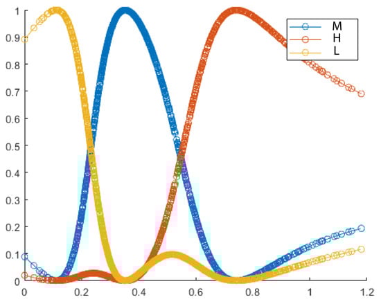 Each of the object descriptors (area A, fractal dimension D, and eccentricity E) obtained in the first stage of the image processing pipeline (Figure 3) was considered a crisp input variable of the fuzzy system. That is, the input vector with n = 3 variables in Figure 4 is given by ( x 1 , x 2 , x 3 ) = ( A , D , E ) . Each of these variables was fuzzified using the C-means [44] fuzzy method with 3 classes ( K = 3 ) representing k = 1 high (H), k = 2 medium (M), and k = 3 low (L). Membership functions obtained in this way for the descriptor D (fractal dimension) are shown in Figure 5. The 3 membership functions of the other two descriptors were obtained in a similar fashion.