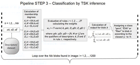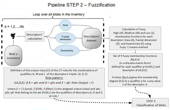A rule base was built considering the three descriptors with the 27 rules shown in Table 3. The rules were defined according to previous knowledge on the morphology and granulometry of the additive materials (EVA and fiber) and the pores in the analyzed specimens. The outputs of the inference rules y r , r = 1 , 2 , , 27 are constant functions with 3 discrete values: 1 , 2 , and 3, representing the classification of the object as pore, EVA, and fiber, respectively. The processing described in this section up to this point is illustrated in Figure 6.