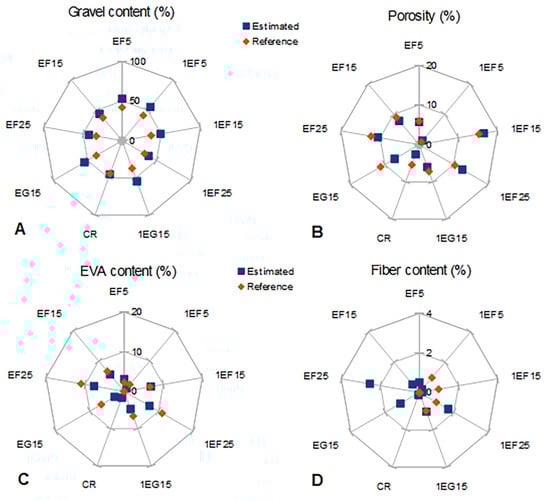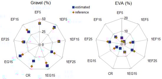 The calculated metrics are shown in Table 8, and in Figure 11 we plot the reference values on the vertical axis and the estimated values for the pore, gravel, and EVA contents on the horizontal axis, together with the proportional model obtained by regression in each case.