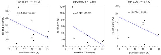 These rates of decrease are statistically supported by the significant anti-correlation observed, with coefficients varying between r = 0.49 for pore content and r = 0.585 for EVA volume. The standard deviation of the differences in relation to the linear model was confined to the range of s d   = 6.2 % for gravel content to s d = 28.0 % for EVA content. The values of the rates of decrease in the relative differences between the estimated and the reference values, as well as the correlation with the content of additives (EVA + fiber) and the standard deviation in relation to the adjusted linear model, are listed in Table 7. These results confirm that the relative difference between estimates and references decreases as the proportion of light aggregates increases.