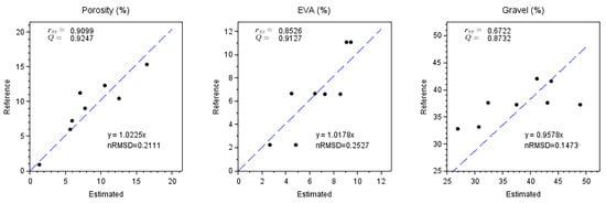 Figure 11. Visualization of the linear correlation between the reference values and values estimated for porosity and EVA and gravel contents, indicating the values of the metrics used.
