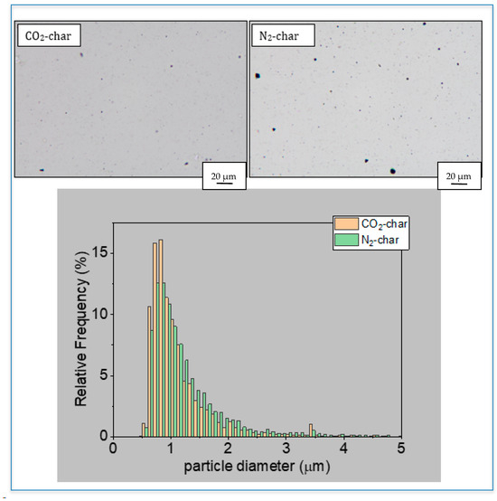 Top panel: CO2-char (left) and N2-char (right panel) dispersed in silicone oil (bar length equals 30 µm). Lower panel: particle size distributions for CO2-char and N2-char dispersed in silicone oil.