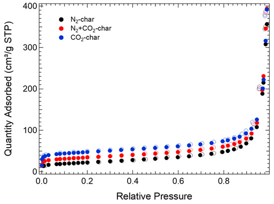 Figure 2 shows the nitrogen adsorption/desorption isotherms acquired on the samples labelled as N2-char, N2+CO2-char and CO2-char at liquid nitrogen temperature. The curve relative to an unpyrolysed waste tire is not shown since, due to its almost zero specific surface area, it was not possible to acquire the isotherm. According to the IUPAC classification [31], the shapes of the isotherms are predominantly of Type II with a very small contribution of Type I (P/P0 < 0.05) and a more meaningful contribution of Type IV (0.85 ≤ P/P0 ≤ 1.0), with a presence of a slight H1-type hysteresis. For these reasons, we can assert that synthetized materials have a slightly porous structure, which are composed of a very small part of micropores (<2 nm) and a preponderant part of mesopores (>2 nm).