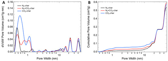 Table 3 summarizes the structural differences. It reports the parameters calculated by analyzing adsorption isotherms. Figure 3 shows the pore size distributions (PSDs, Figure 3A) and cumulative pore volume (Figure 3B) evaluated using NLDFT. The higher cumulative pore volume of the CO2-char sample is evident.