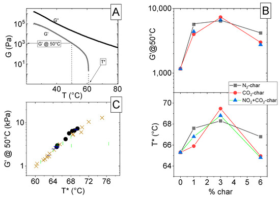 It is interesting to note that the two quantities are generally correlated, as clearly visible in the correlation plot of Figure 4C. It must be pointed out that G′@50 °C refers to the Y-value of the G′ plot in Figure 4A, and T* refers to the X-value at which the curve drops in the same plot, so they are two independent parameters. The fact that they both give the same information means that they can be safely considered as self-consistent indicators of the effects exerted by char. The data in Figure 4C are compared with literature data (bitumens reinforced with organic molecules [35] shown by brown crosses, cellulose [36] shown by vertical green bars and inorganic fine particles [37] shown by horizontal blue bars). Clearly, all the data share the same behavior, suggesting universal behavior. Upon deeper observation, it can be noted that the data of this manuscript are slightly above the others, confirming that the char under investigation causes a marked effect on G′@50 °C. The fact that the proposed chars cause a bigger effect on the increase in G′@50 °C rather than in T* could be the consequence of the interactions between the char particles and the bituminous matrix being more effective at lower temperature, but they easily become less effective as the temperature is increased, thus ruling out particular effects when temperature approaches the transition temperature T*, where the effect is therefore not higher than that of any inert filler. However, the effect of char addition on the increase in G′@50 °C being quite high is noteworthy.