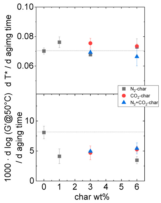 However, a quantitative analysis is insightful: to highlight the effect of char addition, an estimation of the change in G′@50 °C and T* with the aging time (i.e., the slopes of the plots G′@50 °C and T* vs. aging time) as a function of char addition was evaluated. Results are reported in Figure 5. It can be seen that the increase in T* with the aging time is almost constant for all the amounts of chars added to the bitumen and it does not differ from the values for the reference (undoped) bitumen. In addition, no significant effect is seen if the flowing gas is changed.