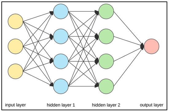Each FF-ANN ANN model comprises at least one hidden layer with multiple nodes, one output layer with one or more output nodes, and one input layer with multiple input nodes (Figure 4). Each node in a network can manipulate data using a unique activation function, such as the sigmoidal function [21,44]. FF-ANNs, on the other hand, have no connection between nodes located on the same layer. Regularization is often utilized in learning methods to increase generalization capacity when working with small sample sets or when data samples are meaningfully contaminated by noise [45]. In this research, we used the Bayesian Regularization (B.R.) method to improve the ANN’s generalization ability by modifying the objective function of the ANN to avoid overfitting and to smooth down ANN’s mapping by enforcing certain prior distributions on the model parameters and penalizing large weights [46].