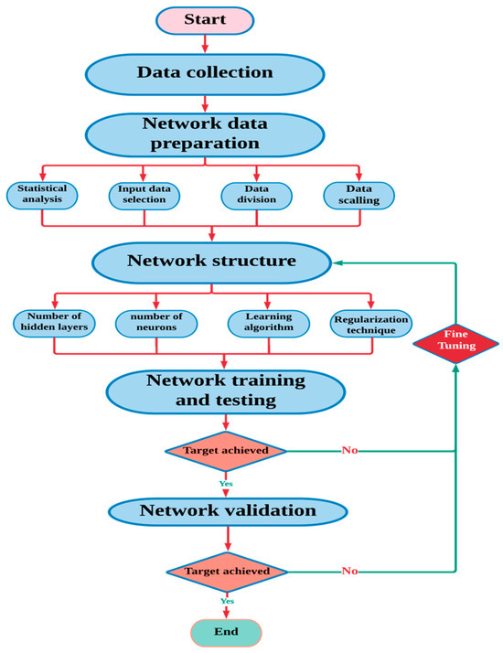 An ANN model’s development is anticipated inside a unified process flow. Data gathering is only the beginning of the lengthy process of building an ANN model; other aspects, such as training and validation, are just as important. Because the ANN relies on data, it needs to be stored and managed correctly. A unified process flow enables the construction, prediction, and fine-tuning of an ANN model. In a neural network, each drawback calls for a different strategy [29,30,31,32,33,34]. A graphic workflow was required to coordinate the numerous neural network model creation phases (Figure 2).