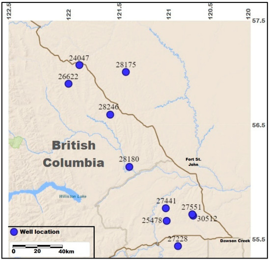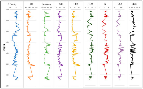 Illite wt.% was extracted from the whole quantitative rock. Clay fraction XRD data were obtained from the British Columbia Oil Gas Commission (BCOGC) database representing ten wells for a total of 306 core and cutting samples (Figure 3) along with a complete set of conventional well log data representing depth, B.D., API, resistivity, sonic (DT-C, DT-SH), and spectral gamma-rays (U, Th, K, SGR, CGR) (Table 1). The well-log responses represent only the depths of the obtained core samples.