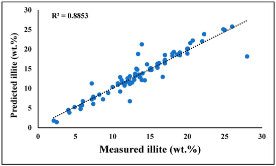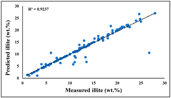 The outcomes were quite promising after training to find the most optimal model for our goals. We aimed for a high R2 and a low mean square (MSE) error between the predicted and the desired values. A scatter plot for the illite wt.% was created using an R2 value of 0.92 from the best-fit model extracted during training (Figure 7).