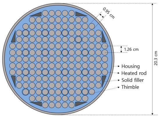 The FLECHT SEASET unblocked test data are designed to observe the reflood phenomena for the unblocked flow in a 17 × 17 fuel rod []. Via these reflood tests, many effects have been examined, such as the pressure, initial clad temperature, flooding rate, rod peak power, and subcooling transient effect. Figure 1 illustrates the bundle cross-section of the FLECHT SEASET experiment. This configuration will be modeled using SPACE to calculate the cladding temperatures and quenching times.