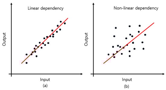 The dependency in the regression tasks: (a) the linear dependency, (b) the nonlinear dependency. The red line indicates the linear fitting method and the black dots represent the data to be fitted.