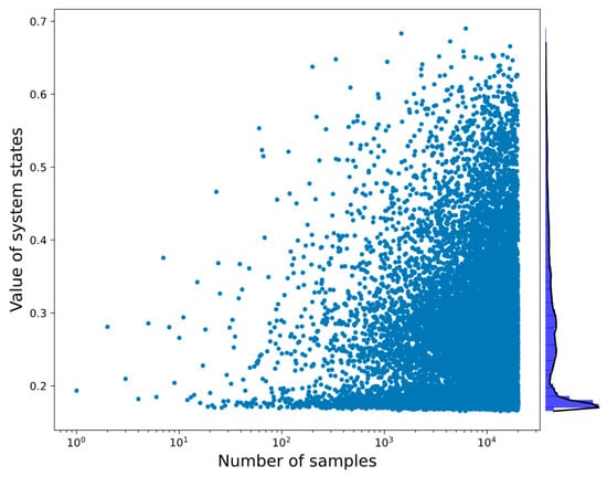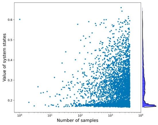 The system states for the training dataset. The histogram of the system states and their values are displayed on the right edge of this figure, where its value distributions present a total of 20,000 samples.