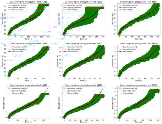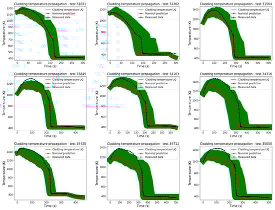 The quenching time and cladding temperature propagations for all reflood tests are illustrated in Figure 5 and Figure 6, respectively. In these results, the term “UQ” referred to the cladding temperature or quenching time results of the UQ analysis, in which the DA method was applied; the nominal prediction referred to the prediction of the SPACE without any adjustment of the physical model; and the measured data referred to the actual data from the experimental work of the FLECHT SEASET reflood tests. The justification for the selected physical models and their corresponding uncertainty ranges, as outlined in Table 2, efficiently enhances the simulation of reflooding phenomena using the SPACE. This result emphasizes the UQ analysis’s reliability, enhancing the code’s predictive capabilities. Furthermore, observing the behaviors of the physical models during the UQ process can be valuable in further developing the physical model in the system code. However, the intricacies of this phenomenon, coupled with the nonlinear dependence of the input parameters on system states, result in a prohibitively high computational cost for the UQ analysis.