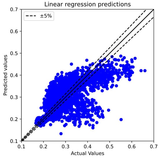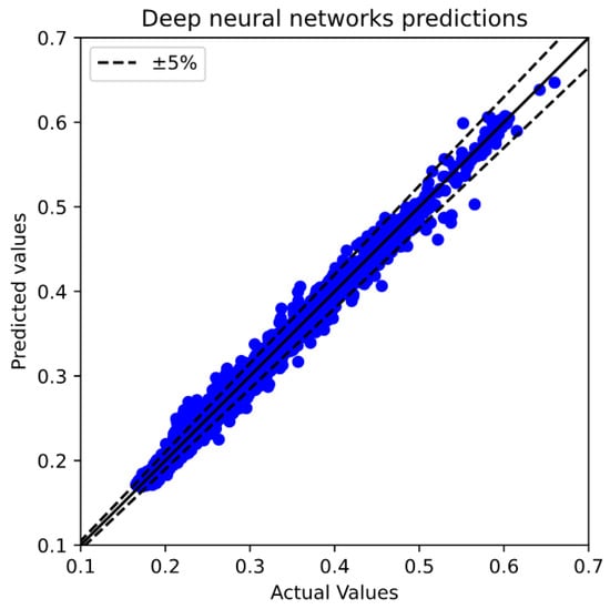 In addition, RF is a learning method based on decision trees. It builds multiple decision trees during training and merges them for a more accurate and stable prediction. However, it may not capture highly complex patterns as effectively as DNNs when massive training datasets are employed. It can be illustrated that the predictions of the DNN with selected hyperparameters have the highest accuracy compared to LR and RF (see Figure 7, Figure 8 and Figure 9), delivering an acceptable consistent identification of the most influential physical model. These results trends were also indicated in the previous studies [,] where the DNNs tended to capture better predictions compared to RF.