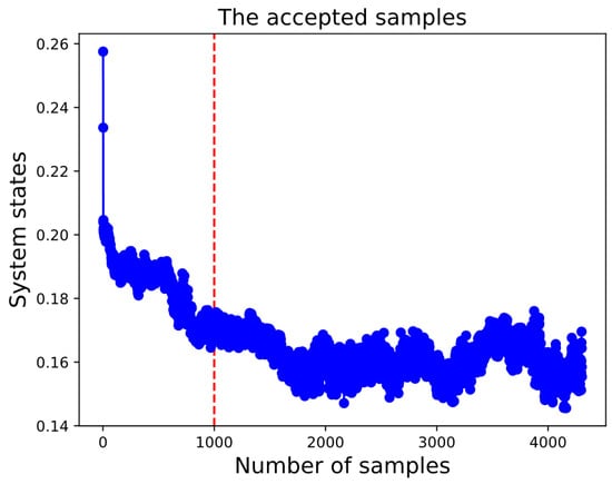 In this evaluation, the output data of the UQ process are examined, calculating the relative accumulative STD of all the physical models (see Equation (1)). It can be revealed that the system state must reach an equilibrium state before evaluating the STD value of all the parameters, and only the accepted samples are used in this investigation. Our observations reveal that the system state approximately stabilizes after about 1000 iterations, suggesting that a based value is identified (see Figure 10). The based values referred to the enhanced predictions which are achieved. Consequently, the evaluation of the STD will be conducted starting from the 1000th iteration.