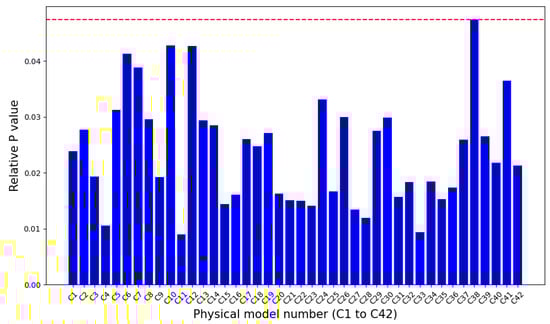 The relative accumulative p values of all physical models. The red-dotted line indicates the maximum value of the relative p values.