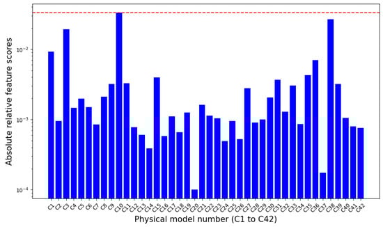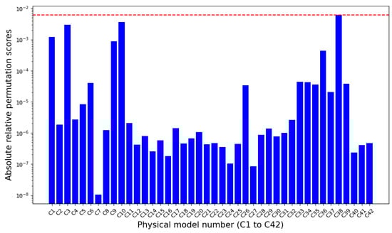The absolute relative permutation importance scores of DNN. The red-dotted line indicates the maximum value of the absolute relative permutation scores.