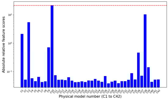 The absolute relative feature scores of LR. The red-dotted line indicates the maximum value of the absolute relative feature scores.