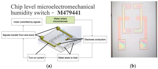 (a) A 3D schematic of the “dual-function switch and humidity” chip; (b) top view from microscopy.