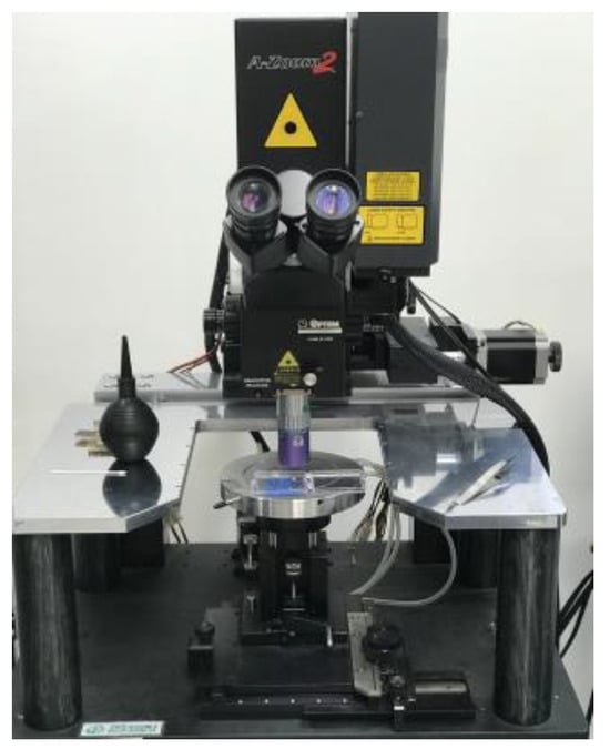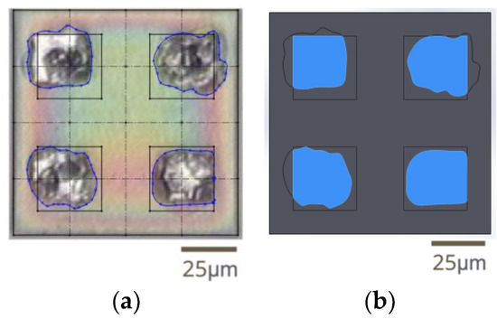 The laser ablation quality reb adopted in this study was originally defined by Tsai and Chan [,]. It is a percentage of area ablated within the square laser aperture. Figure 2a shows a sample that underwent laser ablation. The areas of the laser aperture (28.6 × 28.6 μm2) are represented by black squares outlined with solid lines. In Figure 2b, the areas ablated within the square laser aperture are highlighted in blue for reb calculation. The 532 nm green light laser cutting system, New Wave Research Ezlaze II was utilized, as shown in Figure 3.