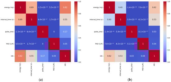 The heatmap in Figure 4a, derived from the 90-sample dataset, reveals the relationships among the features: energy, interval time, pulse shot, pad position, and laser ablation quality reb. Pearson correlation coefficients were employed to quantify the associations between these pairs of variables [].