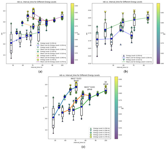 Figure 5a,b depicts the relationship between reb (on the y-axis) and varying levels of interval time and energy. Figure 5a is derived from a dataset of 90 samples, displaying data for three distinct interval times and five energy levels, resulting in a total of 15 boxes. Within each box, the mean is denoted by a blue diamond. Notably, blue diamonds with the same energy level are connected, forming five distinct lines. Each line connects three means corresponding to the same energy level.
