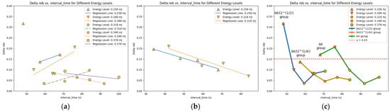 Conversely, the findings depicted in Figure 6b, which are based on the 48-sample dataset, diverge from those in Figure 6a. Notably, the regression lines for both energy levels, 0.258 mJ and 0.318 mJ, exhibit an identical downward trend in Δreb as the pulse interval increases.