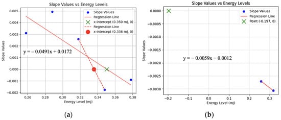 In Figure 7b, however, when plotting the two negative slope values and extending the regression line to intersect the x-axis, it yields a negative energy level of −0.197 mJ. This value is inapplicable within the scope of this study.