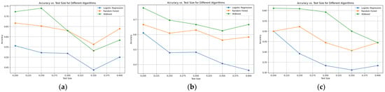 Figure 8a presents the comparative performance of three classification algorithms—Logistic Regression, Random Forest, and XGBoost—in response to diverse test sizes. The algorithms were configured as follows: Logistic Regression was allotted a maximum of 1000 iterations for convergence, Random Forest employed an ensemble of 100 decision trees (n_estimators = 100), and XGBoost utilized the default value of 100 estimators. The x-axis unveils the spectrum of test sizes, spanning from 0.20 to 0.40, while the y-axis illustrates the corresponding accuracy scores. Notably, Logistic Regression consistently exhibits the lowest accuracy among the three models. At a test size of 0.30, a notable crossover occurred where Random Forest surpassed XGBoost, becoming the model with the highest accuracy. The highest accuracy among the three models occurs for the XGBoost algorithm, with an accuracy of 0.74 at a test size of 0.25. For Random Forest, the accuracy varies between 0.56 and 0.67, indicating a consistent performance across different test sizes. XGBoost consistently demonstrates competitive performance, with accuracies ranging from 0.53 to 0.74, showcasing its effectiveness under different test size conditions. XGBoost displays a general decreasing trend in accuracy as the test size increases, suggesting a potential sensitivity to data size. On the other hand, Random Forest maintains a relatively stable trend, indicating robustness to variations in test size.